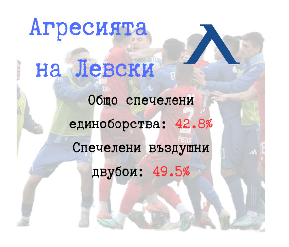 Агресивен ли е Левски? Това е една от полемиките след дербито. Статистиката показва, че въпреки лидерската си позиция Левски губи повече единоборства в мачовете през сезона, отколкото печели!