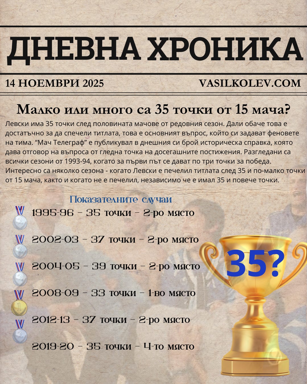- Интервю на легендарния футболист и треньор Любо Пенев пред „Дарик Радио“ е заело централно място на първите страници на двата спортни вестника. Любопитното е, че в „Тема Спорт“ подборът на думите е свързан с... Левски: „Любо даде Левски за пример“. Ел Голеадор е отчел, че Сираков, Боримиров и Йовов са голямо предимство на „сините“, което конкурентите им на вътрешния фронт Лудогорец и ЦСКА се опитват да компенсират с бюджети и обратното. Левски се справя по-добре с по-малко средства благодарение на тримата според Пенев. „Сините“ имаха повече облик в дербито, буквално е цитиран Пенев от „Мач Телеграф“ на неговата първа страница.