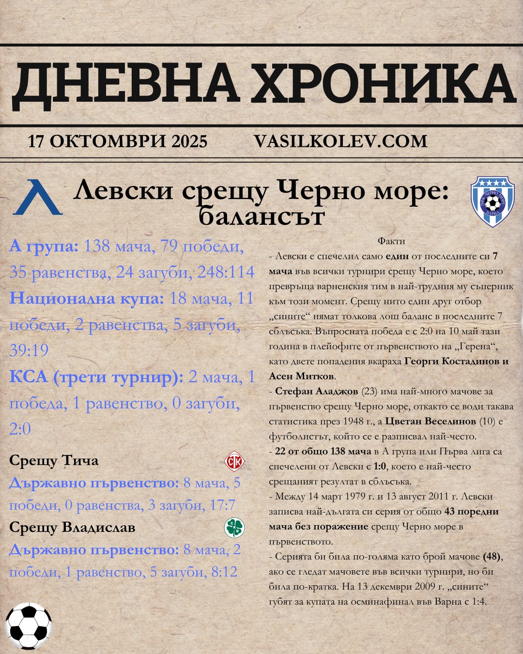 - Напускането на Светослав Вуцов на националния отбор, декларацията на Левски в подкрепа на вратаря и последвалият отговор на селекционера Александър Димитров са голямата и ключова новина във всички спортни вестници и сайтове. Вратарят обяви, че решението му е временно и е готов да се завърне, когато отново се почувства желан в тима. Левски изрази разочарованието си от инцидента и настоя за въвеждането на три стандарта в националния тим: нулева толерантност към унижение, заплахи и публично принизяване на състезатели; въздържан и отговорен публичен език от страна на ръководители и треньори; равни правила за всички – ясно комуникирани изисквания, последователност в прилагането и защита на човешкото достойнство. Треньорът Александър Димитров, който ден по-рано отрече, че изобщо има какъвто и да е проблем със Светослав Вуцов и добави, че е говорил с вратаря, в този случай промени позицията си и призна, че Вуцов два пъти е нарушавал правилника.