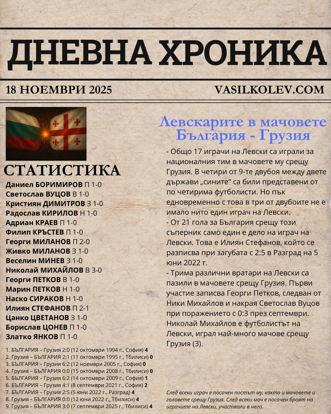 - „Алжир може да притесни сините“, пише в заглавие на основната си новина за Левски „Тема Спорт“. Акрам Бурас е попаднал в плановете на националния тим на Алжир за два турнира, които ще бъдат през декември. Треньорът Маджид Бугера предстои да обяви селекция си за Арабското първенство в Катар от 1 до 18 декември, а след това и за първенството на Африка в Мароко пт 21 декември до 18 януари. Така Бурас може да пропусне, както края на есенната част от първенството, така и значителна част от подготовката на Левски в Турция. Мустафа Сангаре ще бъде в селекцията на Мали за африканския шампионат.