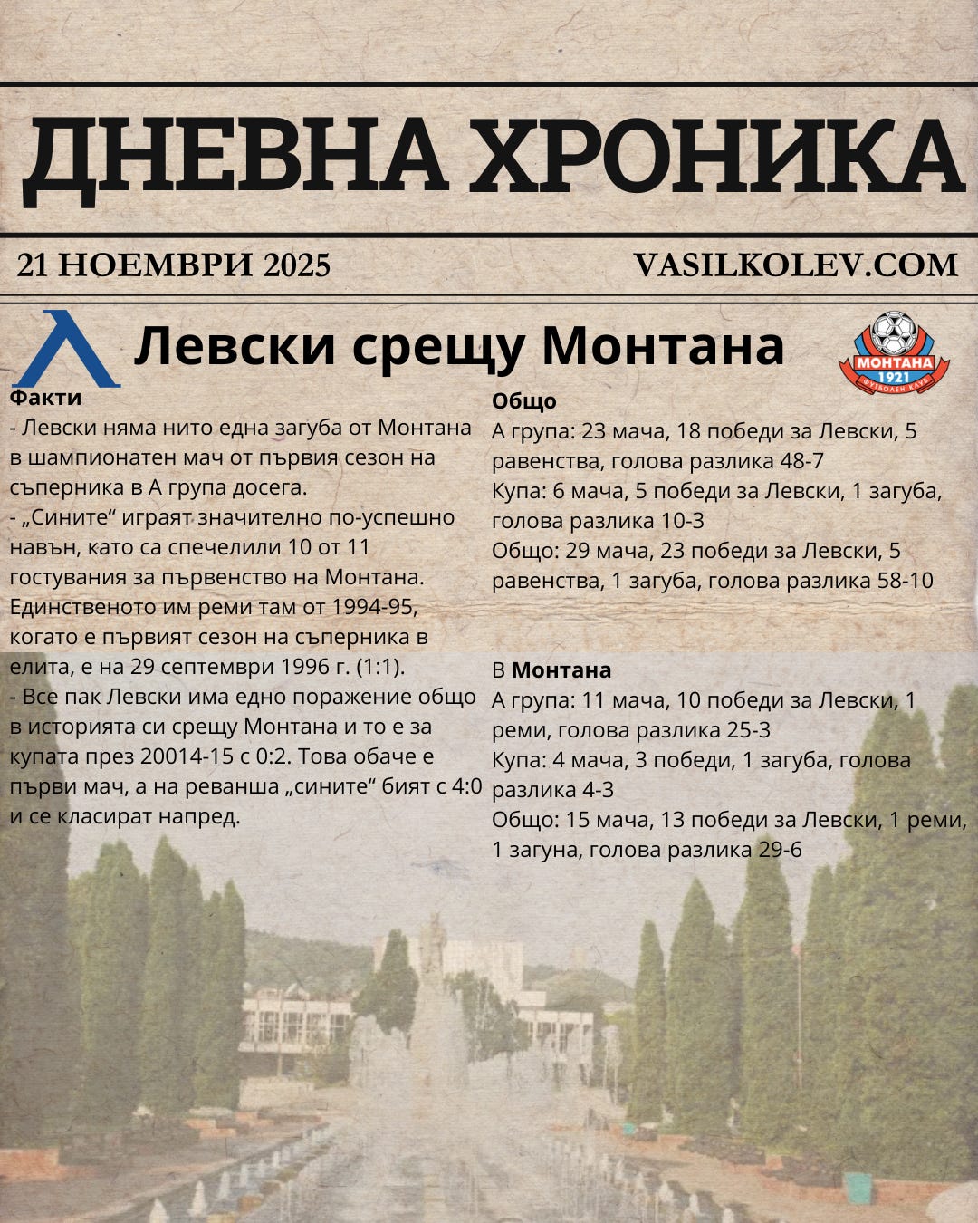 - 54% са шансовете на Левски да рестартира мачовете в Първа лига с победа, изчислява „Мач Телеграф“, като се позовава на статистиката за XXI век след загуба на „сините“ в дербито. Бившият играч на „сините“ Емил Спасов твърди, че Левски трябва да бие с разлика на „Огоста“ в неделя.