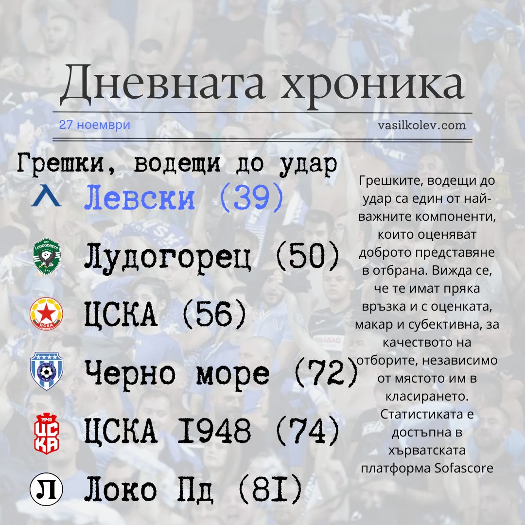 - Левски сведе до минимум вересиите, пише в анализ „Мач Телеграф“. Има се предвид символична класация по грешки довели до удар. Левски е с най-малко от цялата Първа лига (39). Следва Лудогорец с 50 и ЦСКА с 59. Отборът разчита и най-малко на вратарски намеси.