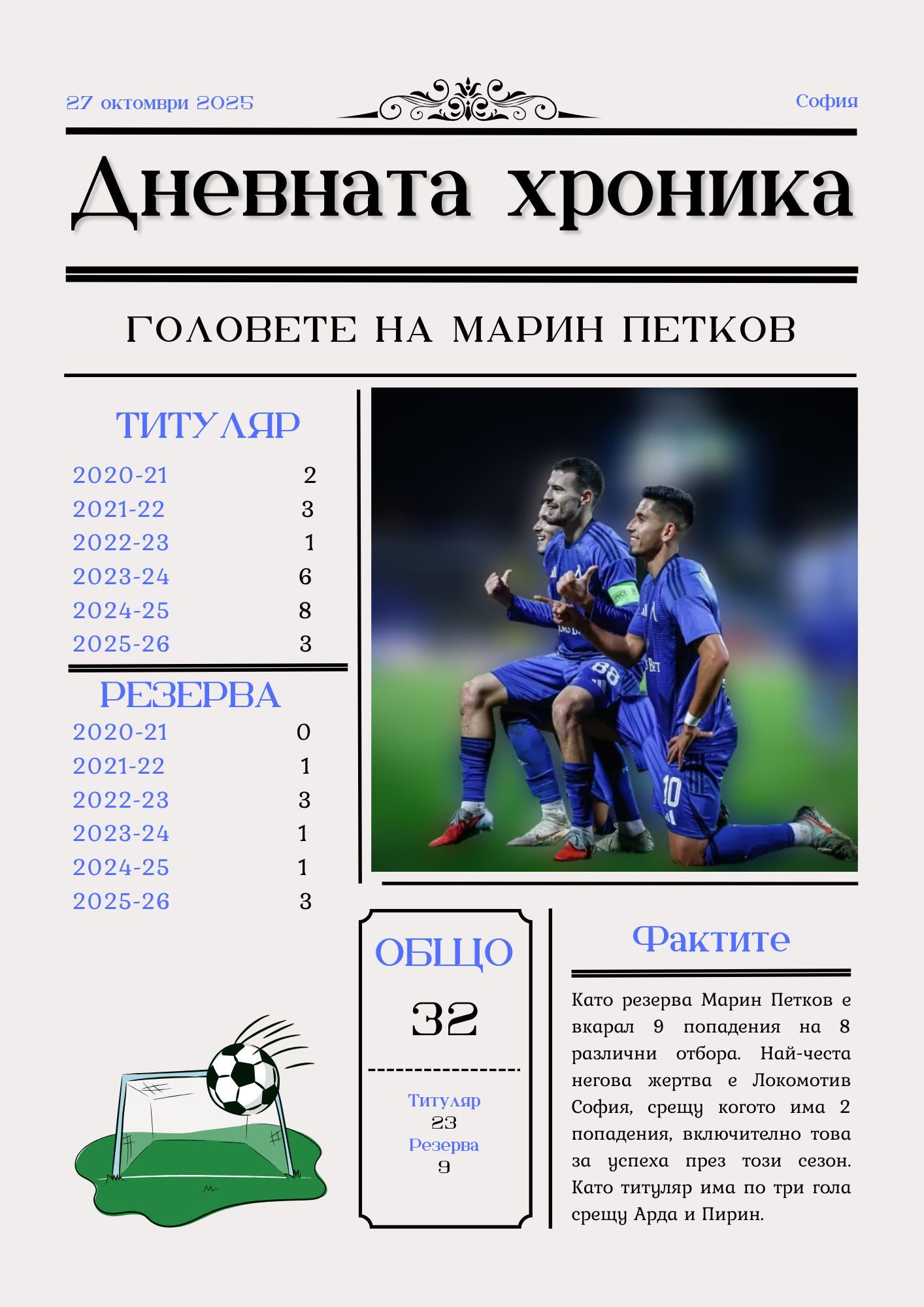 - Марин Петков е вкарал 50% от головете си този сезон от позицията на резерва, пише „Тема Спорт“. „Мач Телеграф“ добавя, че Петков записва най-силния си сезон като резерва с въпросните три попадения. Толкова има и през целия сезон 2022-23.
