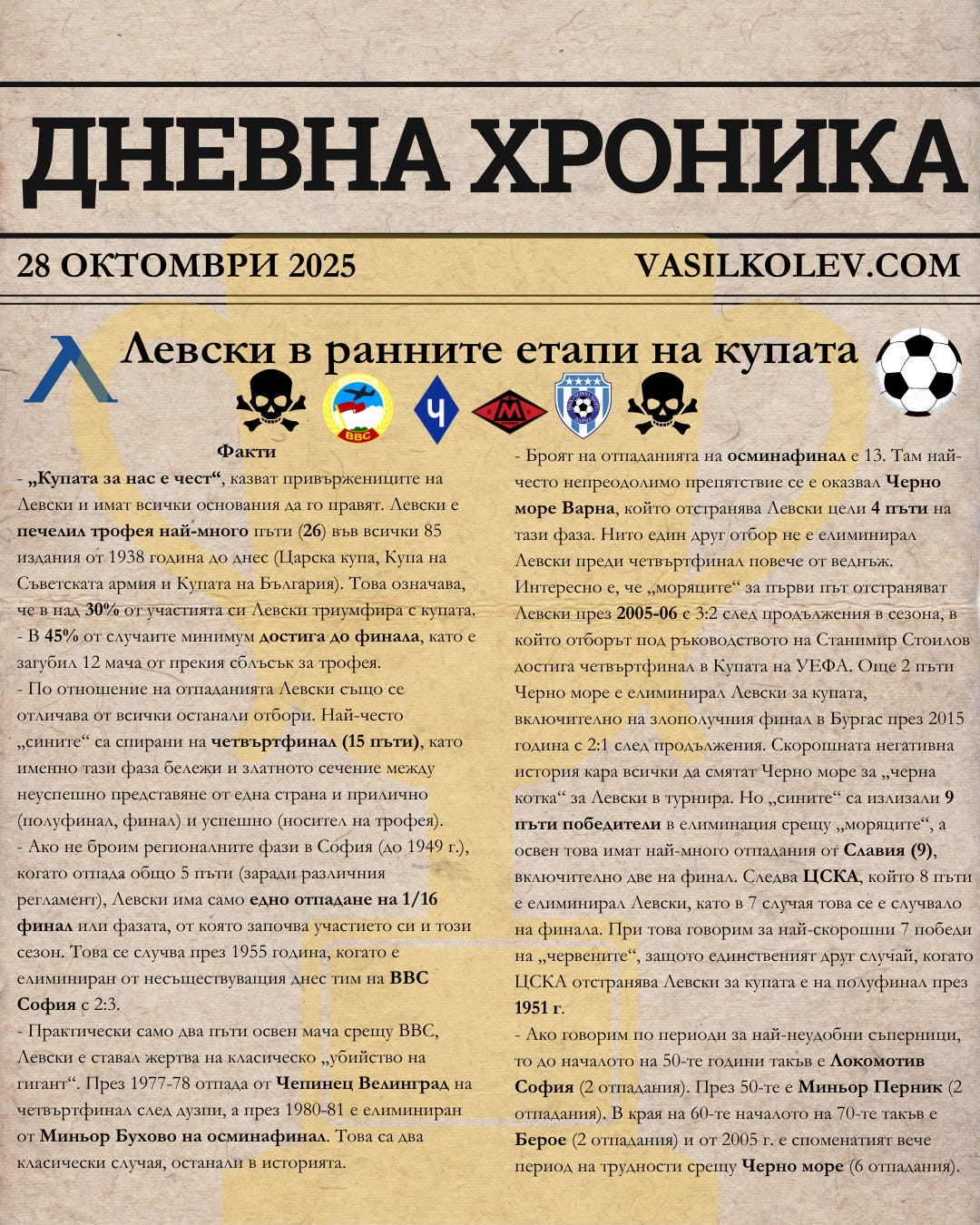 - „Тема Спорт“ информира, че Хулио Веласкес ще „извади каре от фризера“ за мача от турнира за купата срещу Хебър. Това означава, че шансове за изява ще получат трима играчи, които постоянно са извън групата напоследък – Фабио Лима, Патрик Мислович и Карлос Охене, за които се говори, че Левски ще търси начин да им прекъсне договорите още на зимата. Към тях се добавя македонският национал Никола Серафимов, който още не се е адаптирал напълно към тима, а и бранителите, които треньорът използва (Димитров, Макун, Цунами) играят на висота.