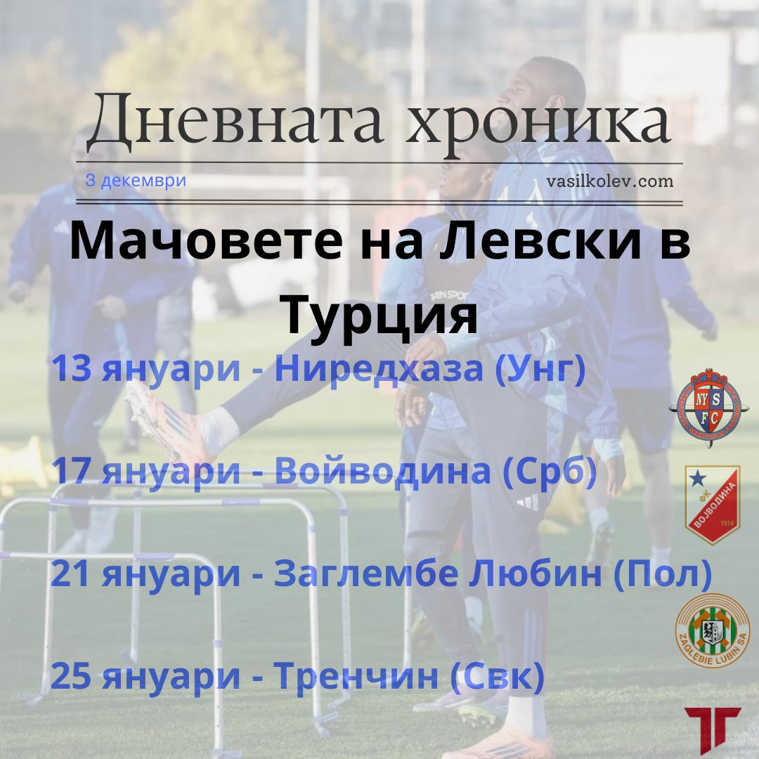 - Списъкът с петте контроли – Ниредхаза (Унг), Войводина (Срб), Заглембе Любин (Пол) и Тренчин (Свк) в Турция и Вихрен на „Герена“, които Левски ще играе през зимата, е заел подобаващо място в медиите.
