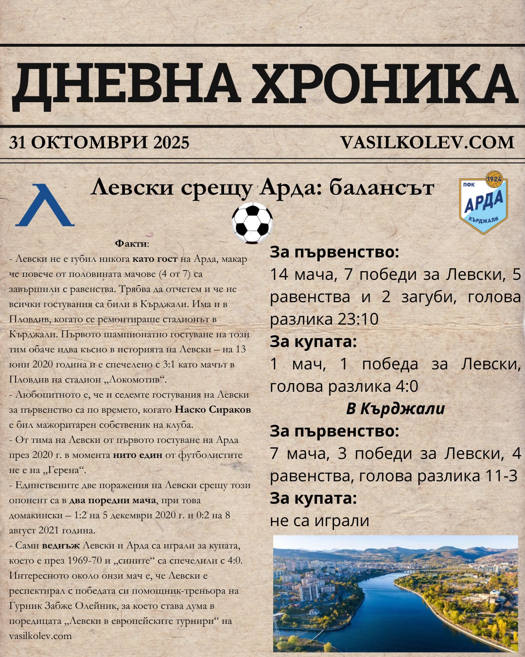 - Евертон Бала все пак е под въпрос и за гостуването на Левски в Кърджали през уикенда, след като се е подготвял индивидуално с кондиционния треньор в последното занимание на тима. Новината идва ден след като се оказа, че травмата на бразилеца от мача с Добруджа не е чак толкова сериозна. Очаква се обаче един от основните играчи на „сините“ да не бъде рискуван, за да бъде на линия за сблъсъка с ЦСКА седмица по-късно. Точно обратна е информацията на другия вестник „Мач Телеграф“, който е категоричен, че Евертон Бала ще бъде вдигнат за мача с Арда.