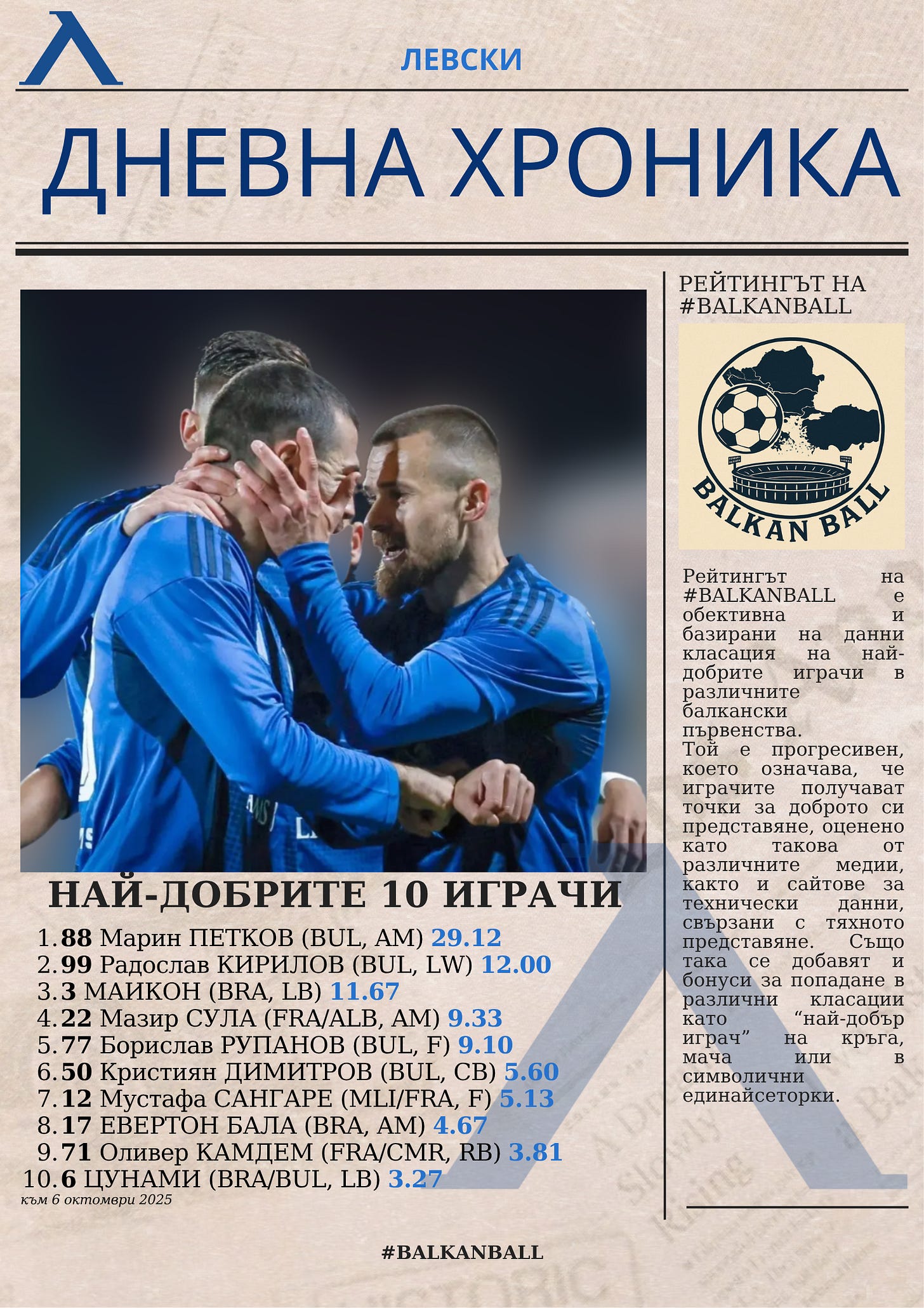 Вестникът изчислява и че Левски има 56% за титла от гледна точка на това, че е първи по време на октомврийската пауза за националните отбори. В малко повече от половината случаи в историята, когато това е било факт, „сините“ са триумфирали накрая. Последният път, когато Левски е бил лидер в този период е през 2016-17, след което финишира трети накрая.