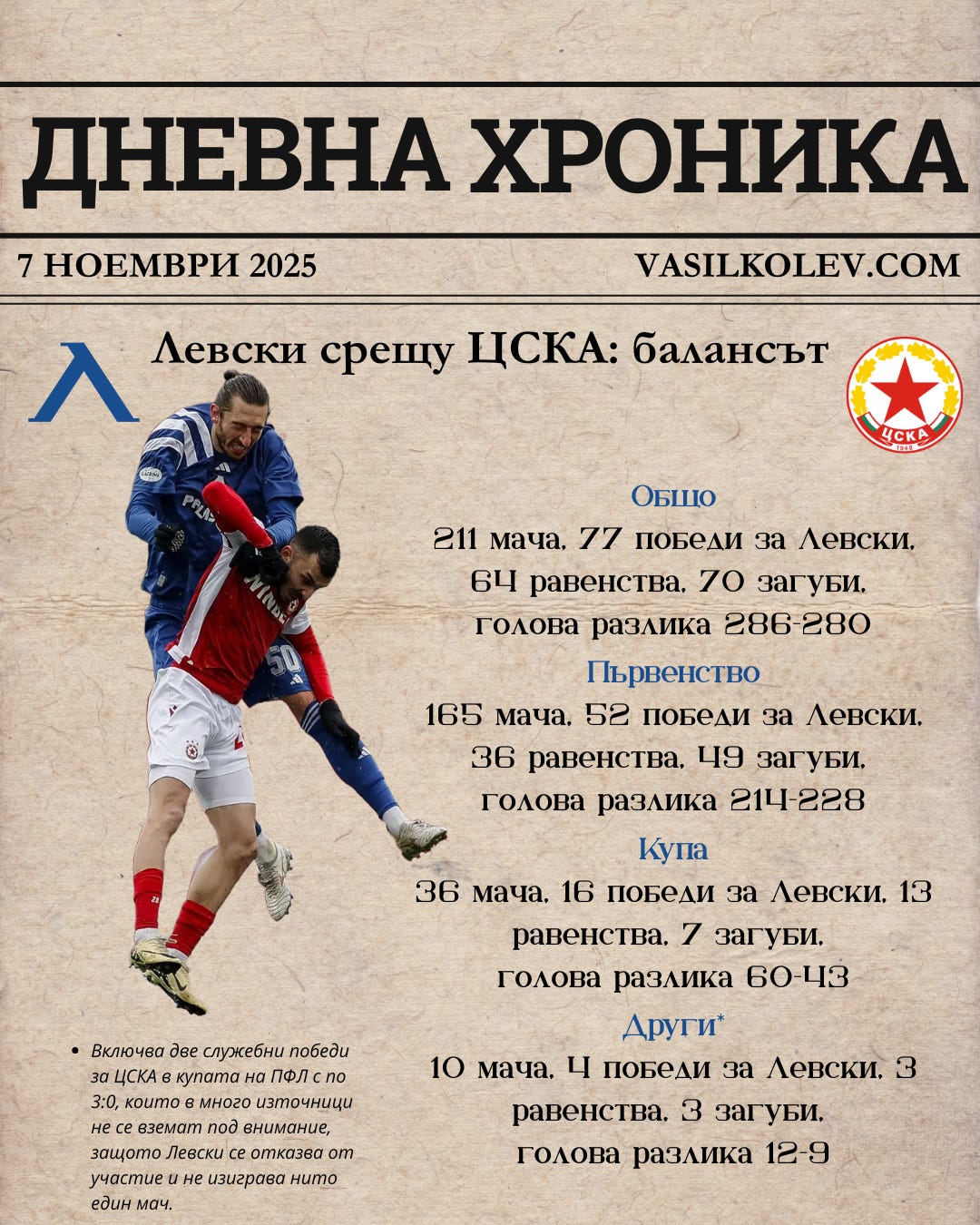 - „Тема Спорт“ е извадил любопитна тенденция от дербито. Оказва се, че ЦСКА има огромно превъзходство на Левски в мач, който идва след като съперниците са направили 2:2 в двубой помежду си. При подобен сценарий Левски и ЦСКА са играли 16 мача и в тях „червените“ са записали 11 победи срещу 1 равенство и 4 успеха на тима от „Георги Аспарухов“.