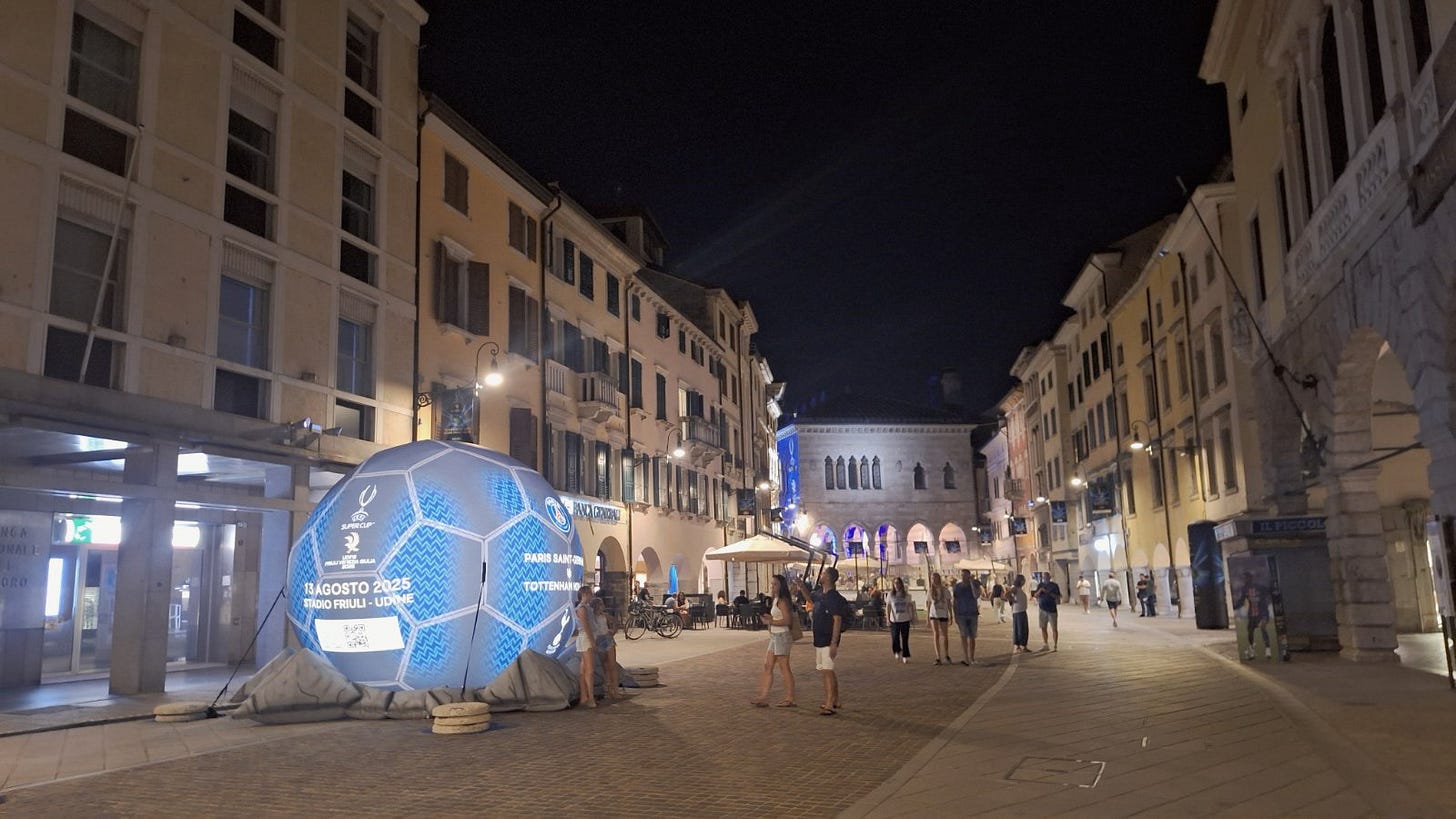 Той не е в центъра на града и трябва автобус до там, защото пеша е около час от спретнатата и красива стара част на Удине. Това също не е толкова лесно, защото Удине почти няма градски транспорт – няколко автобусни линии. Оказва се близо до магистралата и това улеснява идването на хора от околните селца и градчета, „агритуризмото“, които даже си опъват барбекюта в близкия парк преди мачовете на Удинезе и си изкарват чудесно. В центъра вечерта ще се окаже, че за първи път е оживено от много време. Суперкупата е навсякъде – от изложените три трофея, включително тези от Шампионска лига и Лига Европа, с които хората се снимат на централния площад Пиаца де ла Либерта и големите надуваеми топки на близкия Пиаца Джакомо.