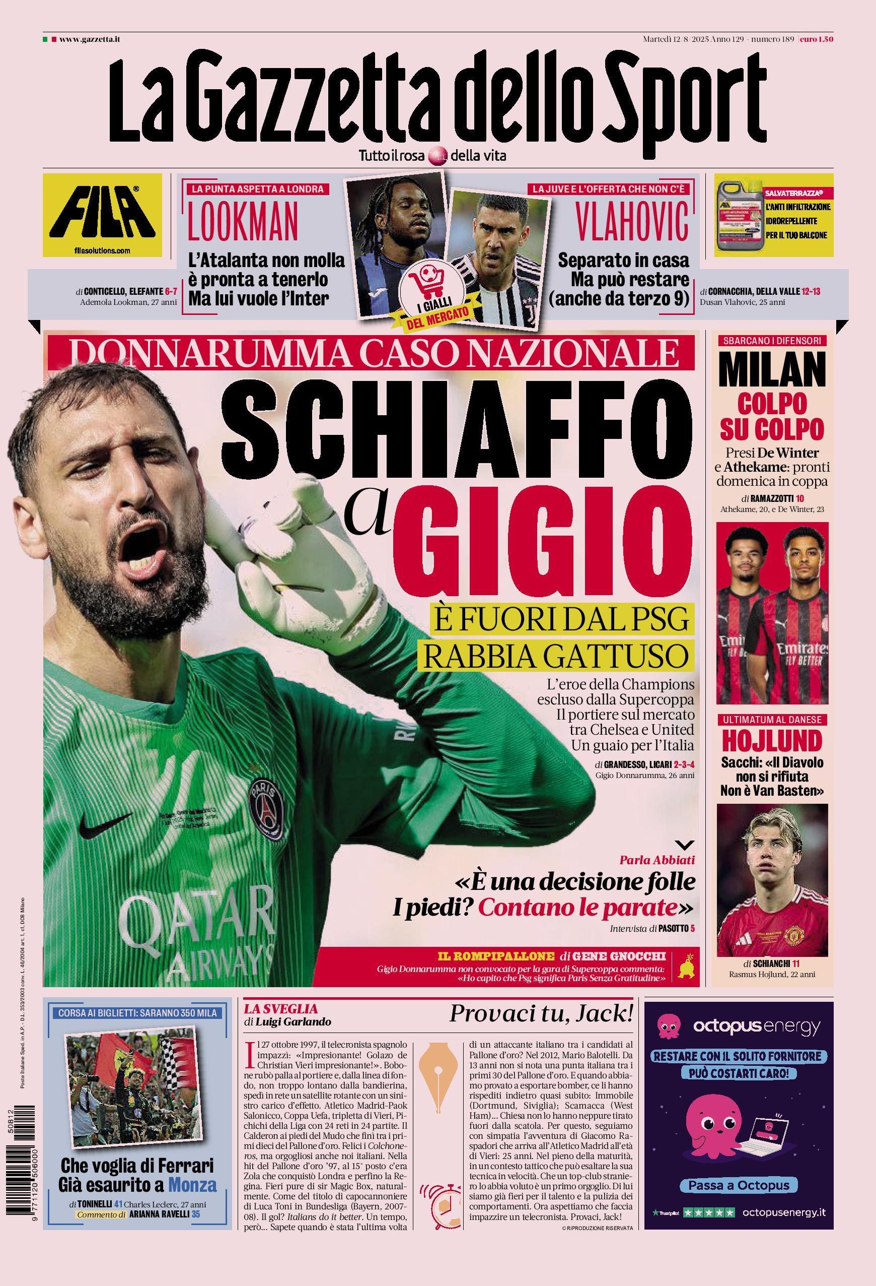 Две неща обаче ще ме стъписат в следващите часове. Първото е истерията, която италианските медии са създали около случая с Донарума. Вратарят се подава от първата страница на „Гадзета дело Спорт“ с огромното заглавие „Шамар за Джиджо“ и проплакването, че това е „национален поблем“. А вътре уточняват „успяха да ядосат Гатузо“, защото бившият халф, биткаджия на Милан и настоящ треньор на Италия ще трябва да избегне крушението скуадрата да пропусне трето поредно световно първенство, след другия шамар в началото на квалификациите – 0:3 от Норвегия на Ерлинг Хааланд. При това положение и след ужаса от последните неуспешни опити за класиране предстоящите битки с Израел и Естония изглеждат кошмарни, а случки като тази с Джиджо натяга истерията до крайности.